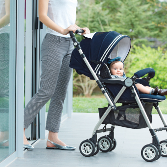 赤ちゃんといっしょにどこへでもいける。対応のベビーカーと組み合わせるとさらに快適に。