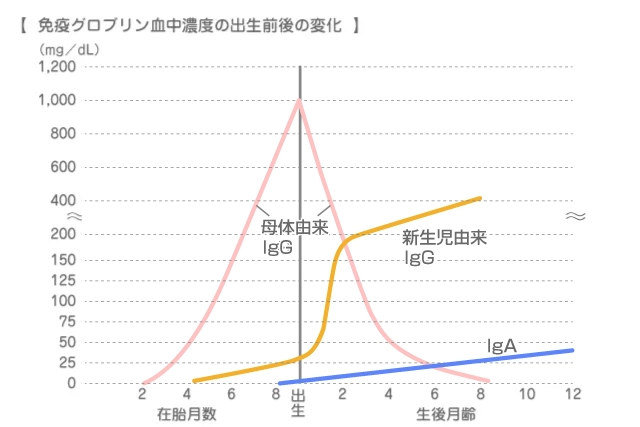 ママからもらう免疫力は2つ。1つはIgGで妊娠中に胎盤を介して赤ちゃんの血液中に運ばれます。ママが実際にかかった感染症や予防接種によって獲得したさまざまな感染症に対する抗体を含んでいます。グラフに示す通り、生後6カ月前後でなくなってしまいます。