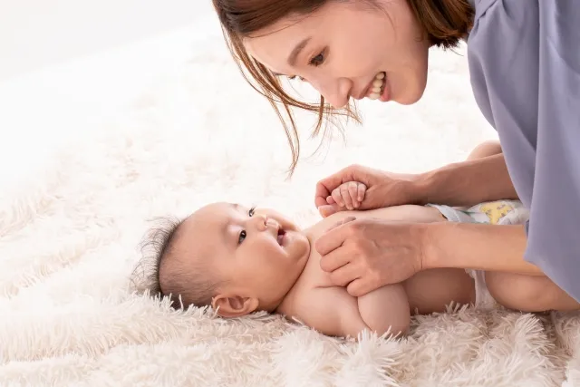 何も難しいことはありません。ご機嫌な赤ちゃんを抱っこしたり、ひざに乗せたり、見つめ合ったりしてみましょう。優しい声で歌ったり、赤ちゃんに語り掛けるのもとても素敵です。ご機嫌がよいときに誰かに関わってもらいながら遊ぶことは、赤ちゃんが脳と体を使うので、そのあとぐっすり赤ちゃんが眠ってくれることにもつながります。