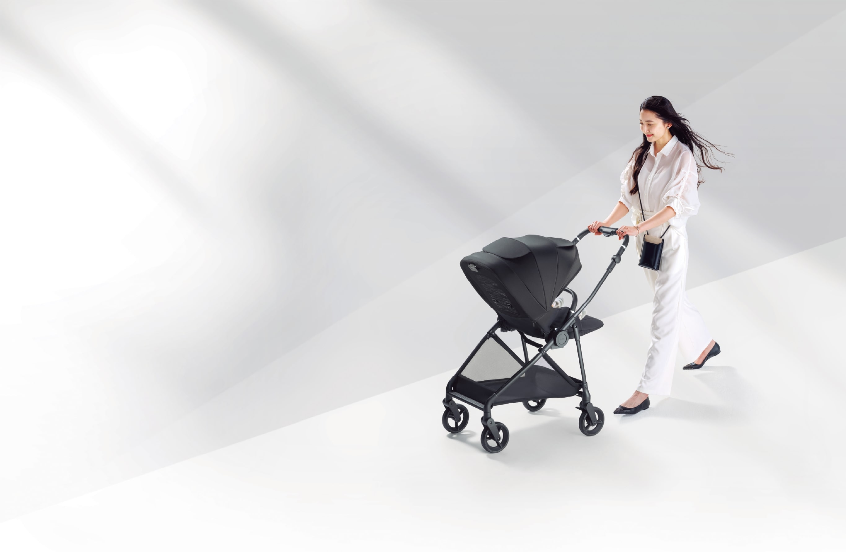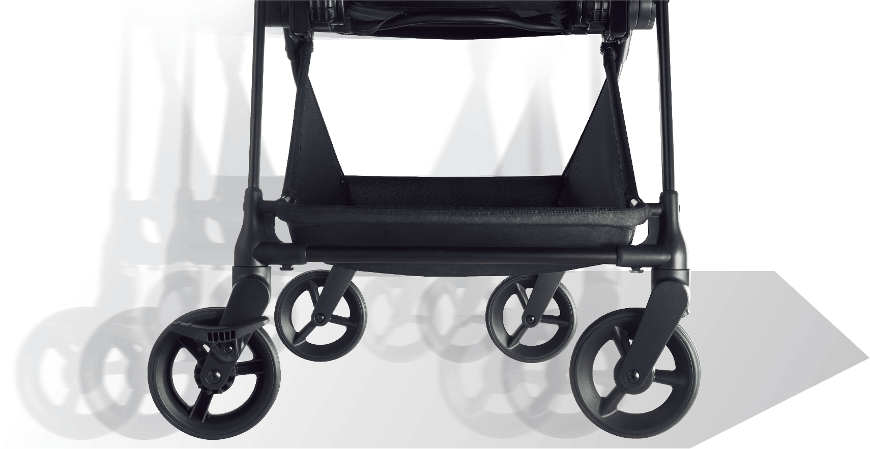 ハンドルレバーをギュッと握れば、4輪全てが自由に動くので、真横にスライドしベビーカーを自由自在に動かすことができます。たとえば、狭い通路などで人をよけたいとき、カフェでベビーカーを引き寄せたいときなどに便利です。