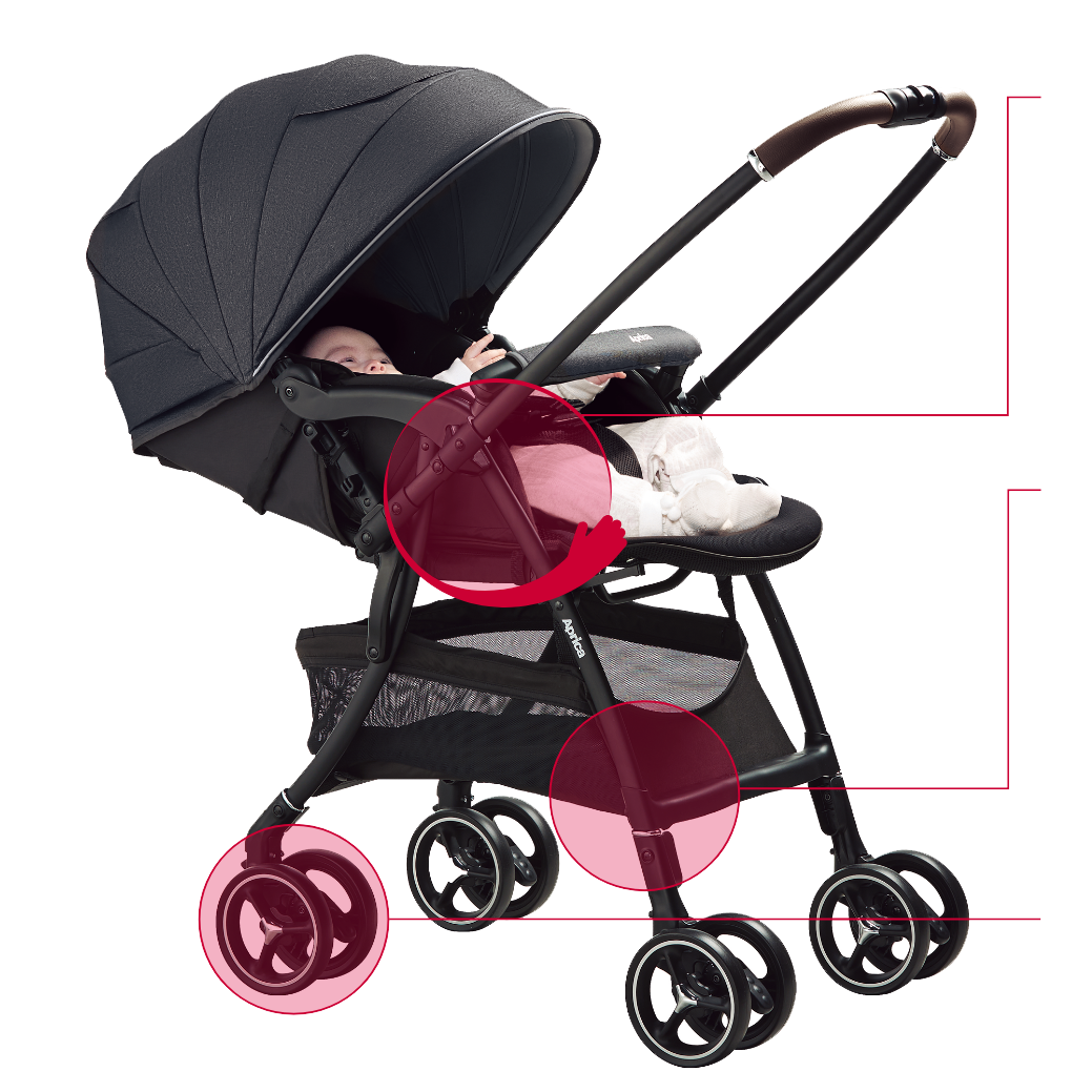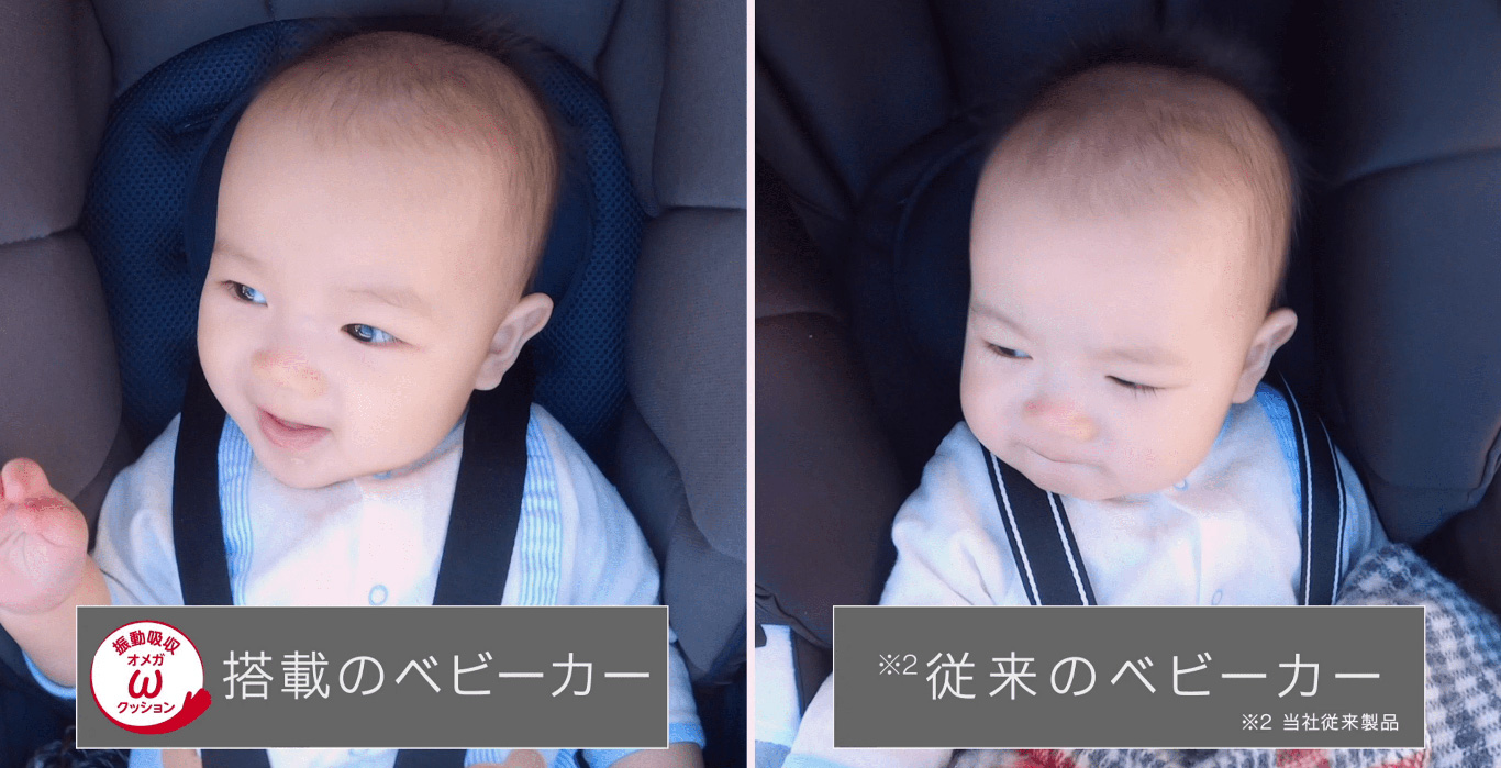 ※1:A形両対面オート4輪ベビーカー/重量5.8kg以下/2019年~2021年国内発売品/店頭価格税込み4万5千円以上/小売り専売品を除く商品群との比較において(2022年1月当社調べ)※2:自社製品比較。段差を乗り越えた時に座面が上下にどれだけ揺れたかの数値。機種及び走行条件によります。2022年1月当社調べ。