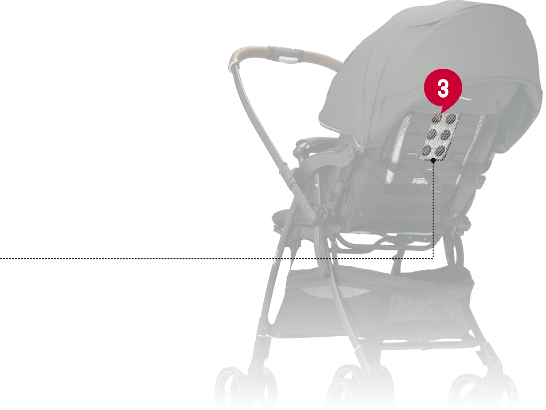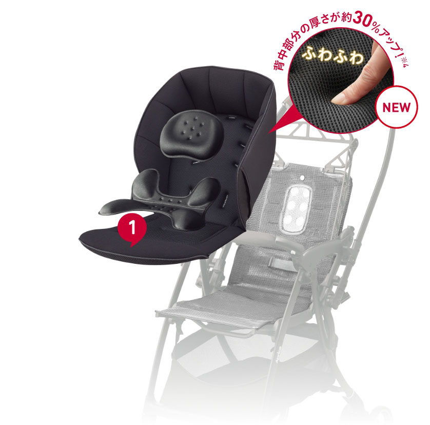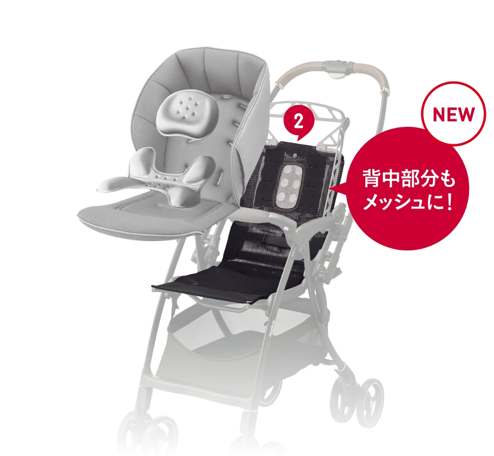 姿勢サポートパッドをそなえたメッシュ本体シート 中の素材は通気性とクッション性を両立したシルキーエアー。取り外して洗える※3ので、いつも清潔に保て、肌トラブルの原因となる汗や雑菌から赤ちゃんを守ります。※3:液温30℃を限度とし、洗濯機の弱水流で洗ってください。乾燥機のご使用はお控えください。 メディカル成長マモール 頭&腰マモールパッドで、首・腰すわり前のまだ未熟な赤ちゃんの頭と腰を安定させ、負担の少ない快適な姿勢を保ちます。 メッシュベースシート ベースシートがお尻から背中までメッシュになって通気性がさらに良くなりました。 風を通し熱をカットするWサーモメディカルシステム 背もたれに設置された通気口が風を通し、反射板が路面の反射熱を跳ね返して座席の温度上昇を防ぎます。
