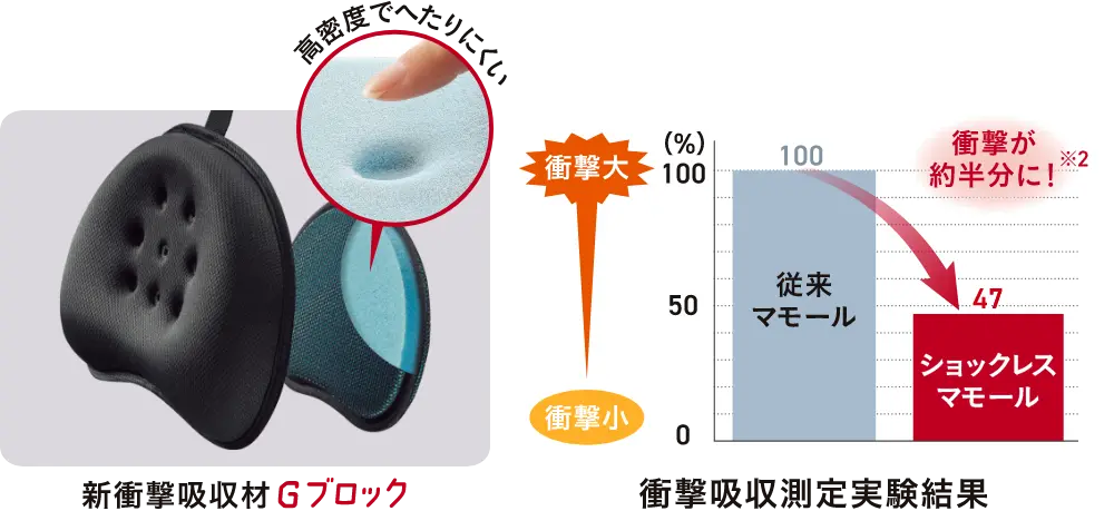 生まれてからの数カ月は、赤ちゃんの脳の発達にとても大切な時期。でも、脳を包む赤ちゃんの頭はまだやわらかく、脳の指令を伝える神経が通る首もまだグラグラです。「ショックレスマモール」がそんな赤ちゃんの未熟な頭から首までをしっかりと守ります。 Gブロックの凄さを動画でチェック! の新採用で頭部に伝わる衝撃が約半分に。※2 高密度で耐久性のある衝撃吸収材「Gブロック」を新採用。当社従来品の素材と比較して、赤ちゃんの頭部に伝わる衝撃を約半分に軽減します。※2 ※2:当社設定の試験条件で測定 赤ちゃんの 首を無理なく支えて、負担を軽減。 高すぎるヘッドパッドは赤ちゃんの首にとって負担になることも。ショックレスマモールは、ほど良い高さで赤ちゃんの首を無理なくまっすぐ支えるから、首の負担が軽減されます。 独自の形状で頭の 左右の揺れを抑える。 赤ちゃんの未熟性に配慮して設計された、赤ちゃんの頭にフィットする独自の形状が、振動による頭の左右の揺れを抑えます。 ※画像はイメージです。