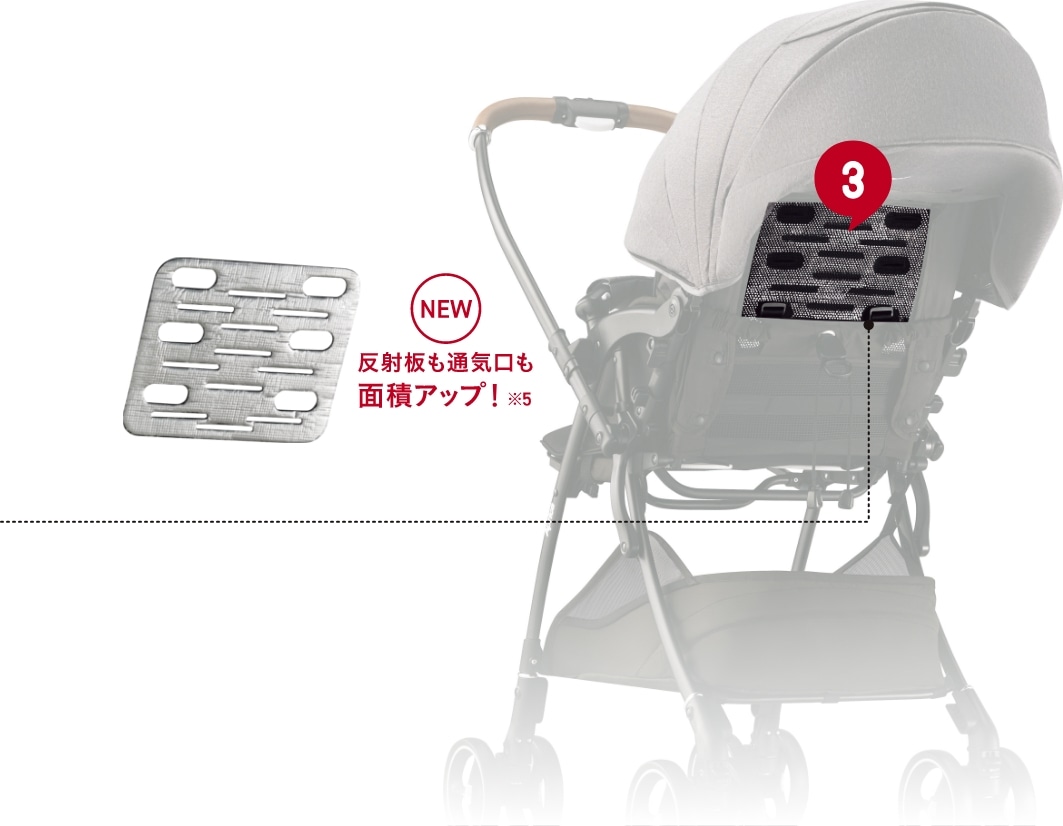 姿勢サポートパッドをそなえたメッシュ本体シート 中の素材は通気性とクッション性を両立したシルキーエアー。取り外して洗える※4ので、いつも清潔に保て、肌トラブルの原因となる汗や雑菌から赤ちゃんを守ります。※4:液温30℃を限度とし、洗濯機の弱水流で洗ってください。乾燥機のご使用はお控えください。 メディカル成長マモール 首・腰すわり前のまだ未熟な赤ちゃんの頭と腰を安定させ、負担の少ない快適な姿勢を保ちます。 メッシュベースシート 背中からお尻までメッシュ素材で、通気性を確保しました。 風を通し熱をカットするWサーモメディカルシステム 背もたれに設置された通気口が風を通し、反射板が路面の反射熱を跳ね返して座席の温度上昇を防ぎます。 ※5:従来品との比較において ※画像はイメージです。
