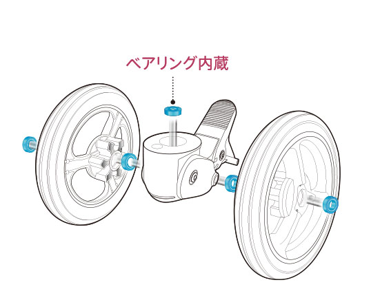 車輪あたり5個、合計20個のベアリングが、車軸を安定させ、回転摩擦抵抗を軽減。
