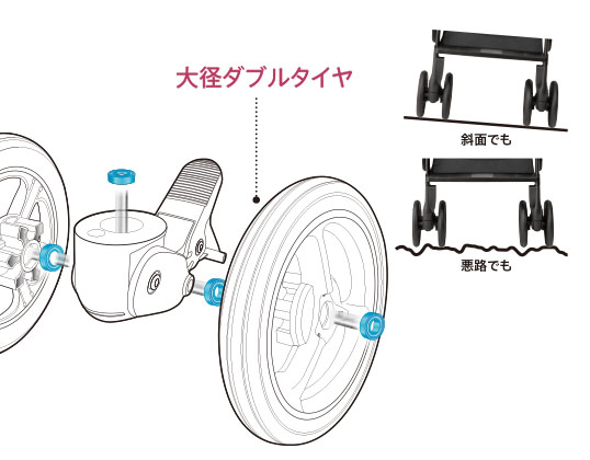 地面との接地点が多い安定のダブルタイヤを採用。さらに15cmに大型化することで、段差乗り越えもサポート。
