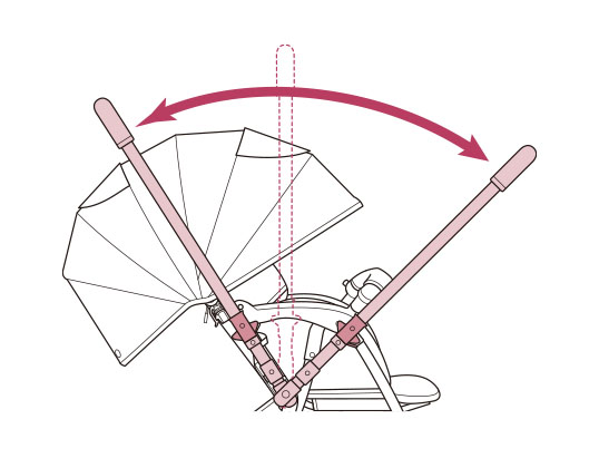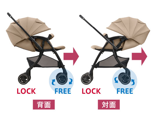 風や日差しを避けたい時、赤ちゃんを乗せたまま、ハンドル切替レバーの操作だけで、対面・背面が切り替えられる。