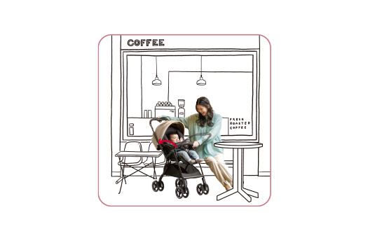 赤ちゃんといっしょにどこへでもいける。対応のベビーカーと組み合わせるとさらに快適に。