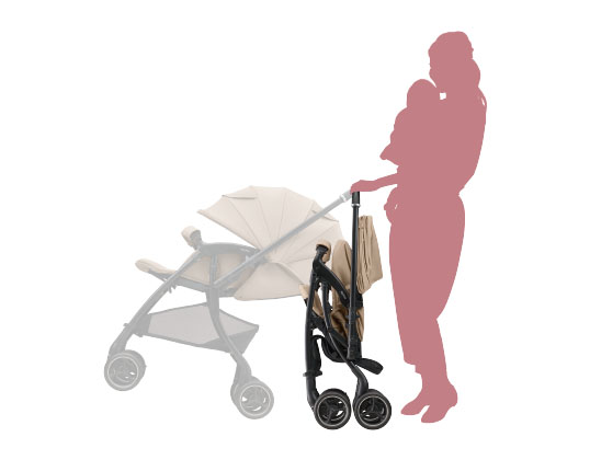ベビーカーを閉じた時、フロントガードを持てるので、持ち運びが簡単。階段では腕に通して持ち運ぶこともできる。