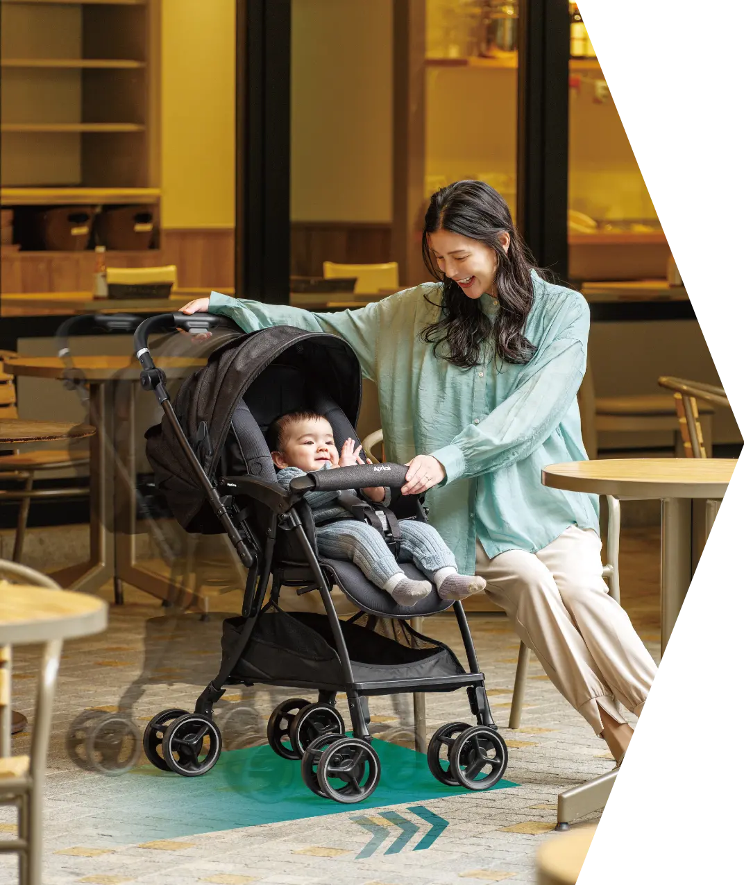エレベーターの中ってベビーカーだと思うように動けない… そんな時もハンドルレバーをギュッと握るだけで スッと真横に軽快スライド!※1人混みや狭い場所でも安心。 他にもこんなシーンに- お店の狭い通路で人とすれ違う時 幅の狭い玄関で横に寄せたい時 4輪フリー搭載製品※2をご使用中のママより 電車の中や細い通路など、人通りが多くて大回りに動けないときには、今まで「早くしないと」と思い、気持ちが焦ることもありましたが、真横スライドができることでその不安がなくなりとても助かりました。※2:クルリー カフェでベビーカーごと少し近くに引き寄せたい… そんな時もハンドルレバーをギュッと握るだけで スッと真横に軽快スライド!※1お出かけの楽しさがもっと拡がる。 他にもこんなシーンに― 水族館や動物園などで真横スライドで景色を楽しむ ※1:移動後は前に動かして車輪の向きを元に戻してください。 *画像はイメージです。