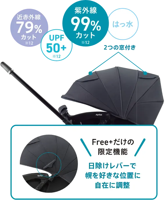 ハンドルの角度を9段階に調整できるマルチハンドル ※11:ラクーナ クッション フリーに対して。 1 身長に合わせて押しやすい角度に 2 身長に合わせて押しやすい角度に すっぽり覆えてしっかりガードカプセルマルチフード+ ※ラクーナ クッション フリー プラスの近赤外線カット率は86%になります。 赤ちゃんの肌にやさしい肩ベルトカバー 地面との接地点が多く安定性に優れたダブルタイヤ 地面からの熱やホコリから赤ちゃんを遠ざけるハイシート53cm ※12:幌表と裏2枚合わせの部分において。近赤外線は波長800~2500nmにおいて。 *画像はイメージです。