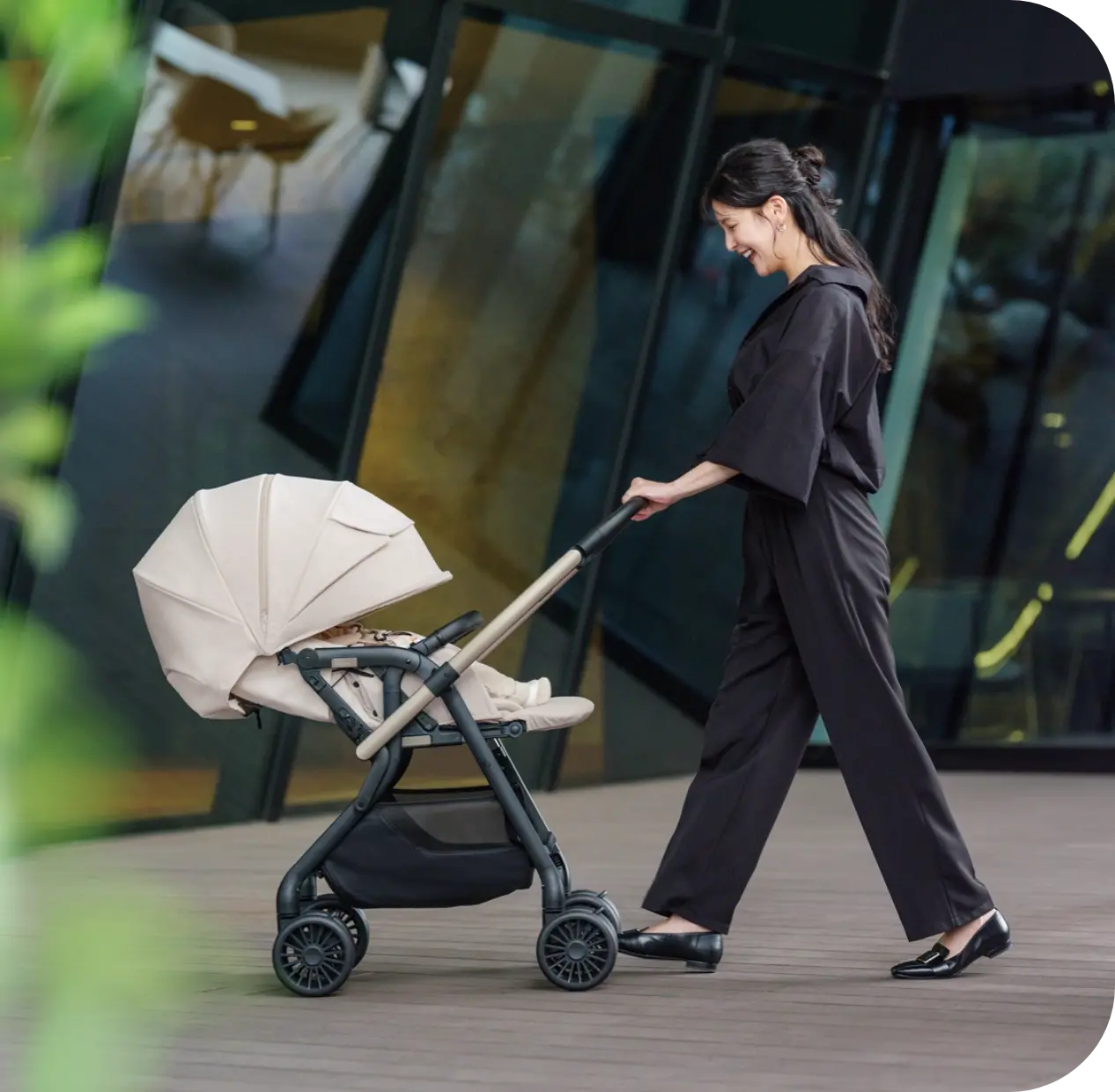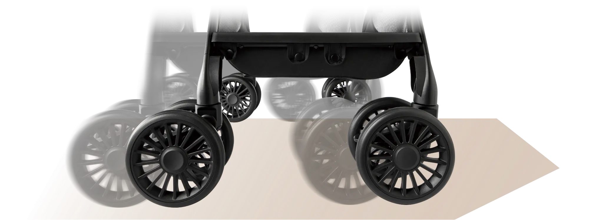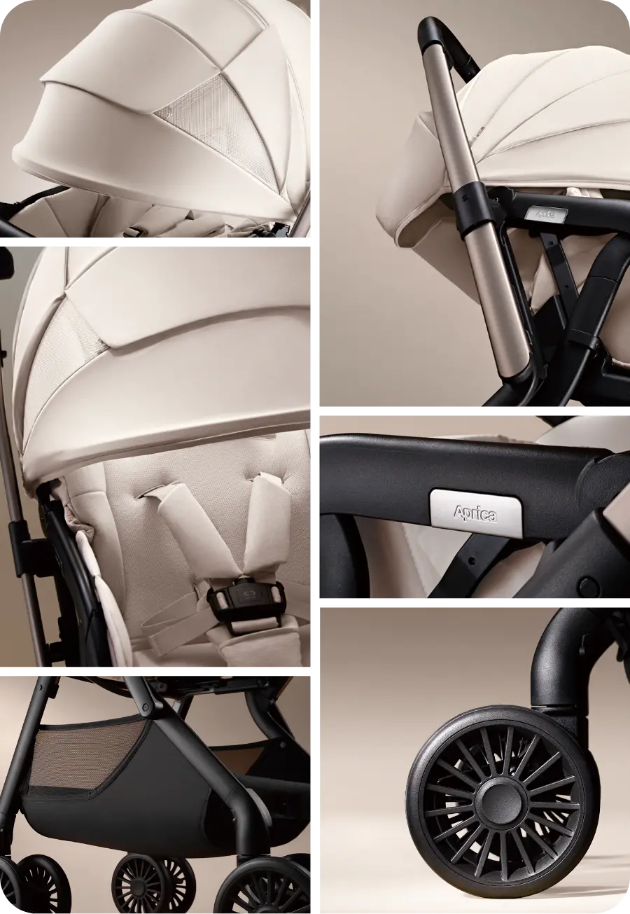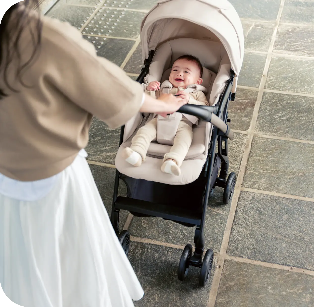 Dynamic Balance. Smooth Ride.スムーズな押し心地 Free is Power.スッと真横にスライド Cushioned for Every Journey.振動・衝撃から守る Good Posture. Good Feeling.最適な姿勢でお出かけを Outdoors, No Worries.外の刺激から守る Easy Makes Happy.スマートな使いやすさを Classic is Magic.良いものは受け継いで Baby Science赤ちゃん医学