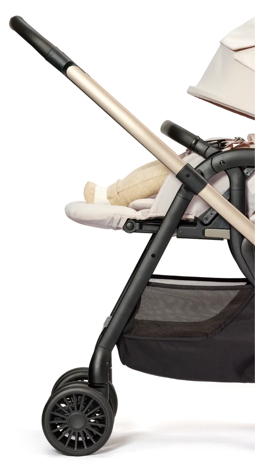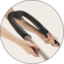 良いものは時代を超えて受け継いで。 ハンドル切り替え両対面 赤ちゃんを乗せたまま、ハンドルの方向を変えるだけの簡単操作で、背面と対面の切り替えができます。例えば、赤ちゃんの様子を見ながら押したい時には対面に、景色を一緒に楽しみたい時には背面に、その場で切り替えができます。 手元ハンドル切り替え かがまずに、手元でハンドルが切り替えできます。 ダブルタイヤ こだわりの理由は安定性。接地点が多く荷重が分散されるから傾斜のついた歩道や、やわらかい路面などでも安定して走行することができて安心です。 ※画像はイメージです。