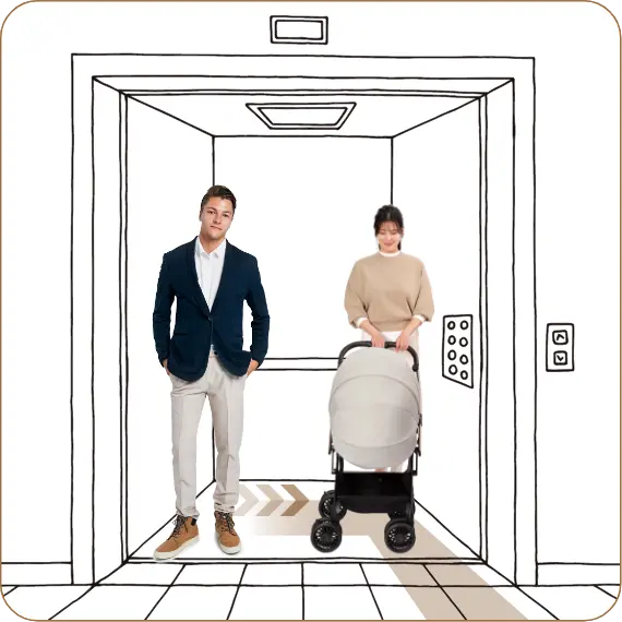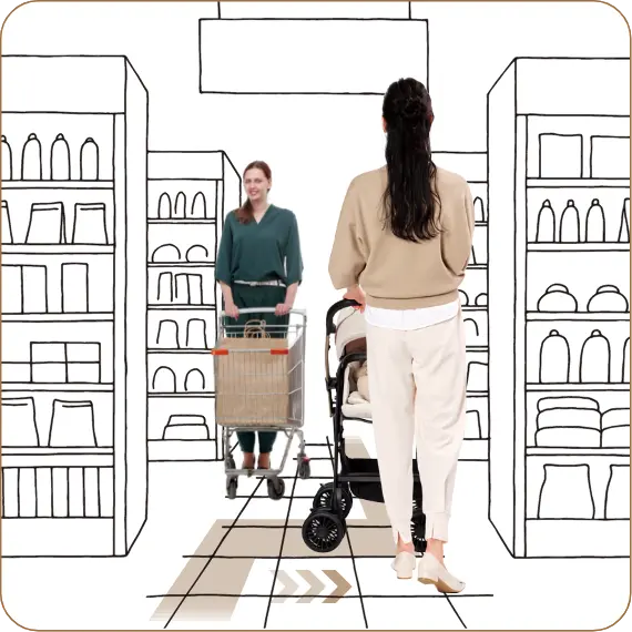 スッと真横に「軽快スライド」で自由自在なお出かけを。※2 ※2 横移動後は前に動かして車輪の向きを元に戻してください。 ※画像はイメージです。 エレベーターの中でも 前に人がいても、スッと真横に移動して出られます。 狭いお店の通路でも 人とすれ違う時、自分からスッとよけられます。 カフェでも ベビーカーをスッと近くに引き寄せられます。