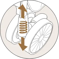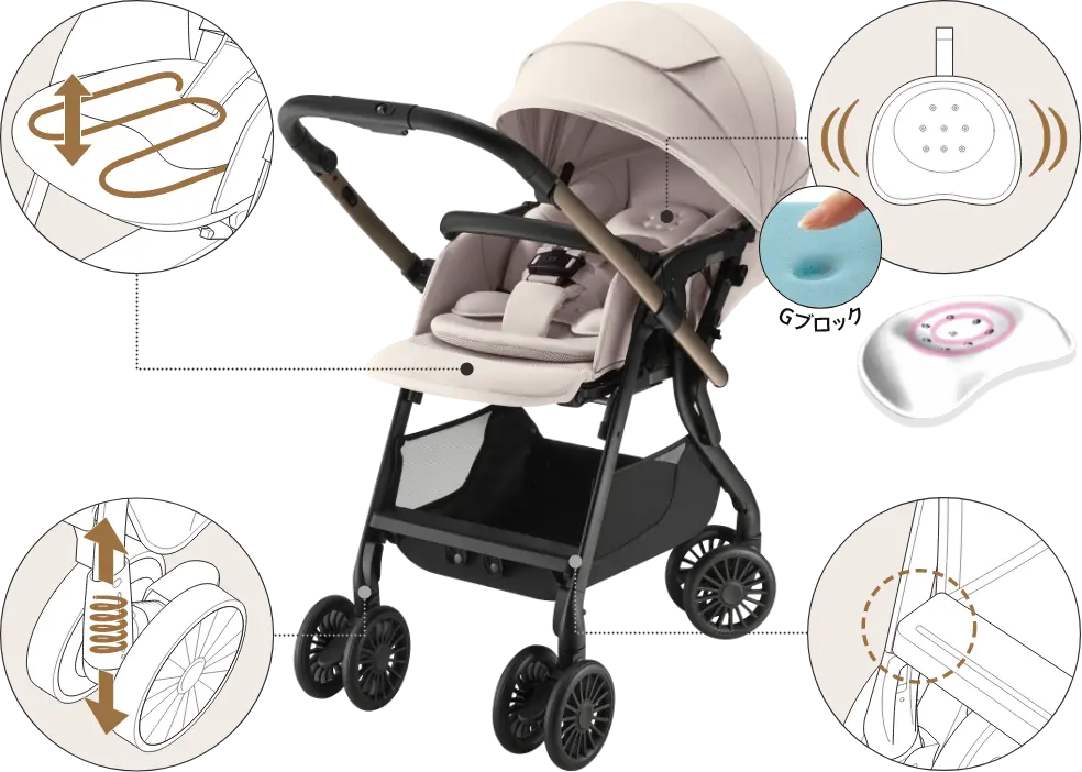 振動・衝撃からしっかり守って最高の乗り心地を。 オメガクッション 座面の下でソファーのクッションのように上下して振動を吸収します。 ショックレスマモール 衝撃吸収材「Gブロック」がやわらかい頭をしっかり守り、赤ちゃんの頭にフィットする独自の形状が頭の左右の揺れを抑えます。 Gブロックは首すわり後も本体シートのポケットに入れてずっと使用できます。 やわらかサスペンション 振動軽減と安定走行をバランス良くサポートします。 がっちりフレーム つなぎ目をがっちり溶接して剛性を高めたフレームが車体のぐらつきを抑えます。 ※画像はイメージです。