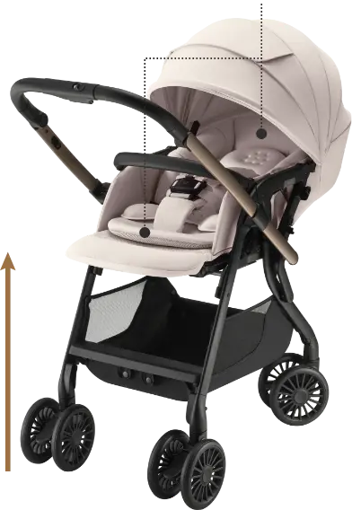 新発想の重心移動で対面も背面もスムーズな押し心地。 ※画像はイメージです。 オートスライドシート ハンドルを対面に切り替えると、連動してシートがスライド。重心位置が近づくことで、小回りがききやすく、段差も乗り越えやすくなります。※1 ※1 オートスライドシート機能ありと無しの比較において。 15.6cm大径ダブルタイヤ 段差の乗り越えやすさをサポートします。