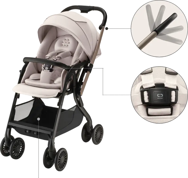 欲張りなまでにラクに、スマートに。 マルチハンドル ハンドル角度を5段階に調節できるから、ママもパパも身長にあわせて押しやすい角度にできます。 イージーベルト ベルトの付け外しがマグネットの力で簡単・スピーディー。ストレスなくさっとお出かけできます。 フロントイン・ビッグバスケット 前からも出し入れしやすく、たくさんの荷物もしっかり収納の大容量34.1L※6。 ※6 座面下空間容積 ワンタッチ開閉・安定自立 赤ちゃんを抱っこしながらでもパッと片手で開閉でき、畳んだら安定自立します。 ※画像はイメージです。