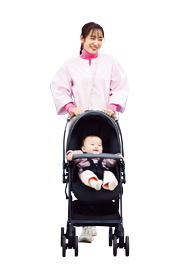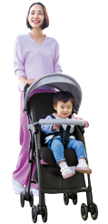 赤ちゃんといっしょにどこへでもいける。対応のベビーカーと組み合わせるとさらに快適に。