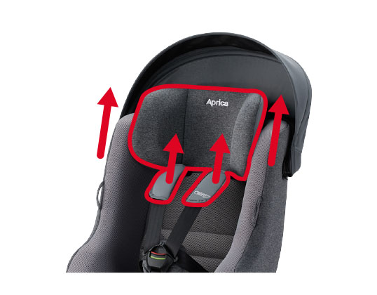 お子さまが大きくなっても、サイズ調節はヘッドの裏側にあるレバーをつかんで上げるだけ。ヘッドレストと連動して肩ベルトの位置も8段階に細かく調節できます。
