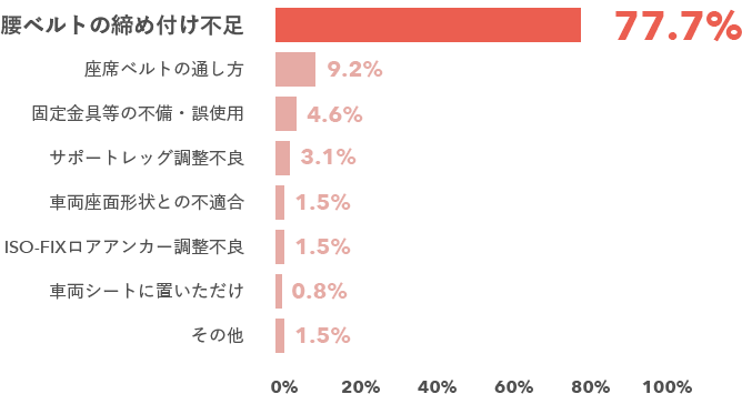 取り付けミスが心配... ミスユースを防ぎさらに安全性が向上! チャイルドシート使用者のうち、50%以上の方が誤ったつけ方をしています! そのうち最も多い取り付けミスは、車のシートベルトの締め付けがゆるいこと。 ISOFIXバーとコネクターで固定するから、しっかり取り付けることができます。 乳幼児シートにおける取り付け時のミスユース ※ ミスユース数は、1台のチャイルドシートに対し複数計上される場合がある。 ※「2015年チャイルドシート使用状況全国調査」JAF・警察庁調べ(n=130)