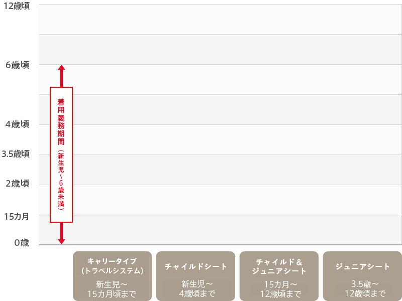 チャイルドシートには、赤ちゃんの体重・発育段階に合わせた3つのタイプがあり、最大12歳頃まで使います。新生児期はもちろん、15カ月以降も、年齢や発育に合わせて、適切なチャイルドシートを選びましょう。
