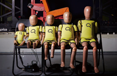 もしもの事故の時、赤ちゃんへの影響を最小限にとどめることはチャイルドシートの最も重要な役割です。アップリカは国の基準で想定されたダミーでの検証だけでなく、産院退院時の目安とされる2.5kgのダミーも安全確認のために2001年にいち早く独自開発しました。現在は、最新のダミー人形を使用して、事故の際、赤ちゃんの頭部や頚部にどれだけの負担がかかるかを正確に計測し、製品開発に役立てています。