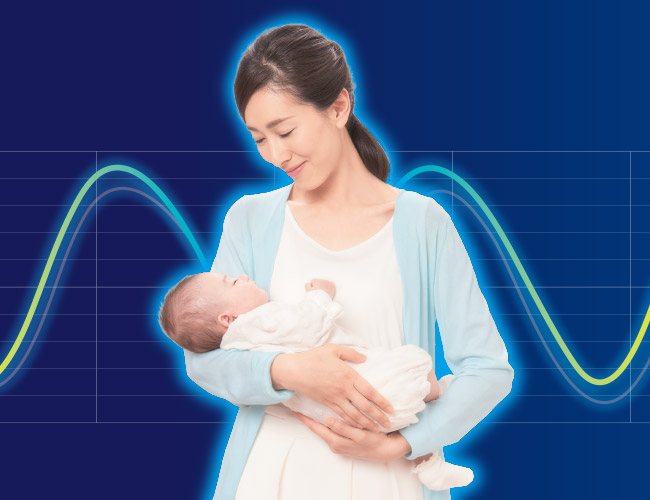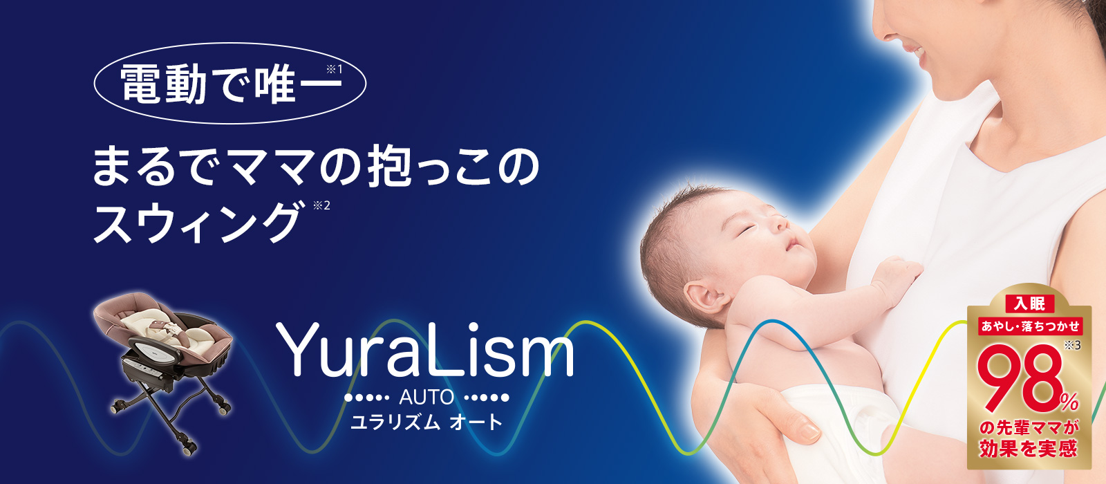 ご機嫌ななめの時も、眠たい時も赤ちゃんが落ちつくママの抱っこ、そのやさしくゆらゆら、抱っこの安心感をかしこい電動スウィングプログラムで実現しました。