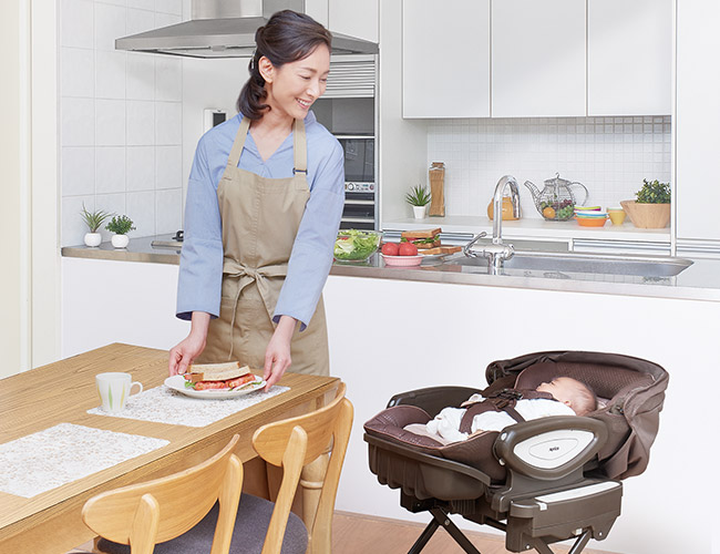 「寝かしつけ」や「日中の居場所」に大活躍。キャスター付きなので、移動もラクラク。