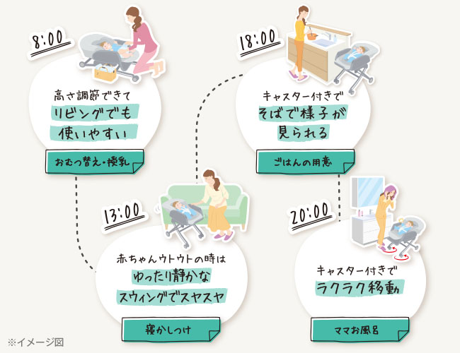 高さ調節できてリビングでも使いやすく、赤ちゃんの状態に合わせてスウィングを選び、あやしたり寝かしつけができます。キャスターがついているのでラクラク移動、いつでもどこでも赤ちゃんといっしょにいられます。