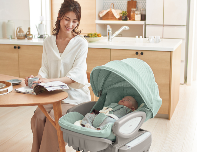「寝かしつけ」や「日中の居場所」に大活躍。キャスター付きなので、移動もラクラク。