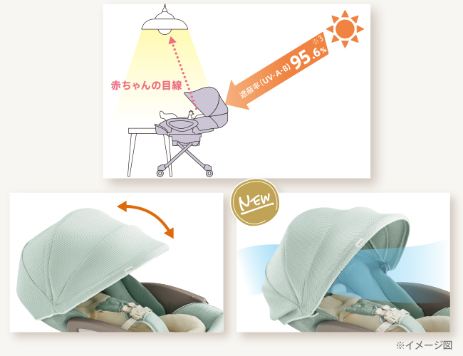 赤ちゃんの視界に直接入る光や、照明の明るさをほどよくさえぎり、室内に届きやすい紫外線(UV-A)も防いでくれます。フードが長くなって、さらに明るさが調節可能に。また、生地自体に通気性がプラスされ、赤ちゃんは快適、スヤスヤ。