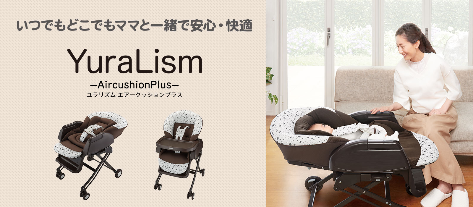 いつでもどこでもママと一緒で安心・快適。寝かしつけに役立つ、手動タイプのスウィングベッド「ユラリズム エアークッションプラス」。「スウィング機能」で赤ちゃんの寝かしつけをサポートします。 家事をしている時も、お食事の時もいつでもどこでも赤ちゃんに目が届くからママも安心。 シートと新生児パッドは洗濯機で丸洗い※1できいつでも清潔、通気性の良い※2シートで汗っかきの赤ちゃんも快適に過ごせます。ベッドを卒業したらお食事用のイスとして、シーンや成長に合わせて長く使える出産準備に欠かせないアイテムです。 ※1 乾燥機のご使用はお控えください 日陰干し推奨 ※2 背もたれ部分