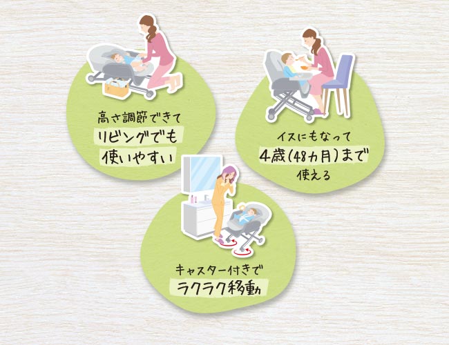 6段階の高さ調節でリビングでも使いやすい。キャスター付きでラクラク移動できるから、いつでもどこでも赤ちゃんといっしょにいられます。さらに、イスにもなって4歳(48カ月)まで使えます。