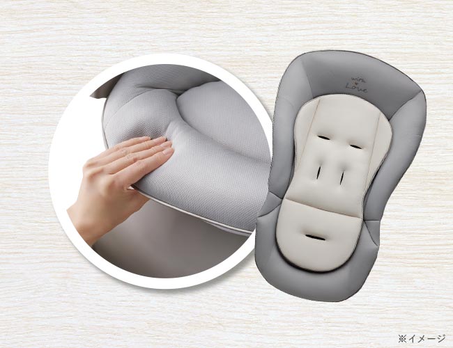 シートが厚みがあって心地いい「ふわふわクッション」で快適。しかも、赤ちゃんの自然な姿勢をサポートする「ダブル台形シート」。自然なのびのびスタイルに合わせて、上半身はW型、下半身はM型。股関節脱臼の予防に配慮した構造です。