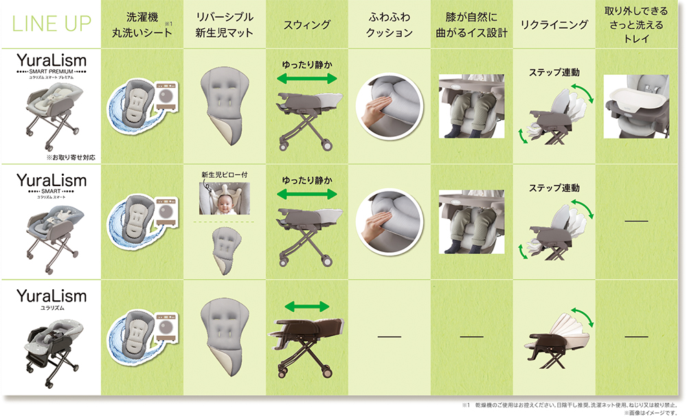 赤ちゃんスヤスヤ、ママほっと一息。 手動タイプのハイローベッド&チェア「ユラリズム スマート プレミアム」。 ゆったり静かなスウィングで、あやし・寝かしつけに大活躍。6段階高さ調節で、リビングでも使いやすい。キャスター付きで、ラクラク移動。イスにもなって4歳(48カ月)まで。ハイローベッド&チェアは、こんなに使えるママの味方です。 厚みがあって心地いい「ふわふわクッション」で快適。「リバーシブル新生児マット」でインテリアや気分に合わせて楽しめます。そして、「イージーウォッシュ」でいつも清潔。シート、新生児マット、肩ベルトカバー、股ベルトカバーが洗濯機で丸洗いできます。※1 さらに、プレミアムモデルは、取り外し可能な洗えるトレイ付き。※2 ※1 乾燥機のご使用はお控えください。 日陰干し推奨。洗濯ネット使用、ねじり又は絞り禁止※2 電子レンジ・食洗器対応不可 ユラリズム機能比較表