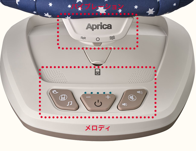 5種のネイチャーサウンド、10種のミュージックが内蔵。さらに、携帯音楽プレイヤーが接続できるので、赤ちゃんのお気に入りの曲をかけることができます。また、バイブレーションで赤ちゃんのあやしをサポート。強さは2段階調節が可能です。