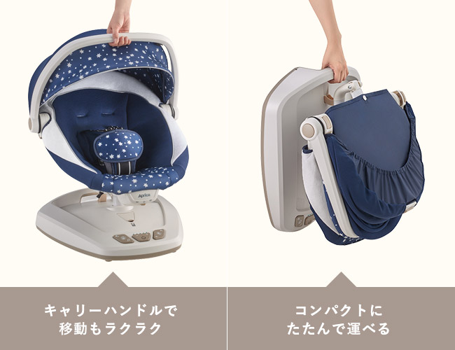 ママに抱っこされているような姿勢でやさしくスウィング。ハイローベッドでもない、バウンサーでもない新しい電動タイプのポータブルスウィング「スマート スウィング プラス」。 たためる、運べる、コードレスで、リビングや寝室など、いつでもどこでも赤ちゃんの「入眠」、「あやし・落ちつかせ」をサポート。 先輩ママ・パパの92%が赤ちゃんの「入眠」、「あやし・落ちつかせ」に効果があると実感※1。 スウィング幅は5段階、おひるねフードやぶらさがりトイ、メロディ機能など、うれしい機能が充実。